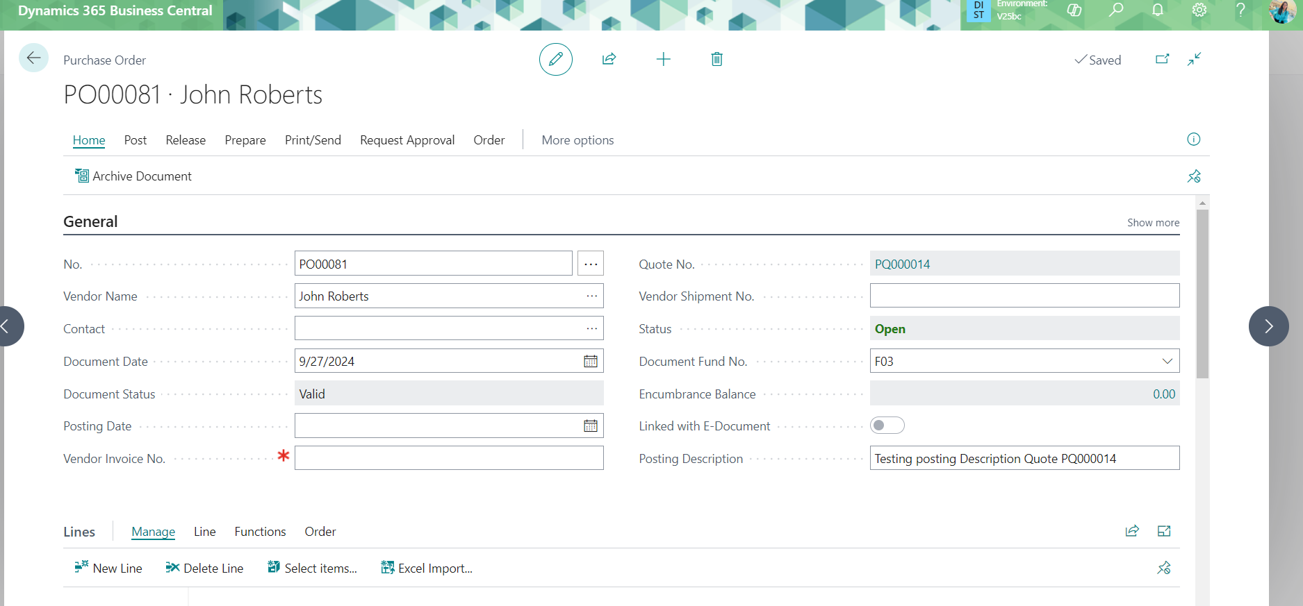 Issue: The posting description was found to be blank when the purchase quote was converted to a purchase order, and the posting description value did not transfer to the purchase order.