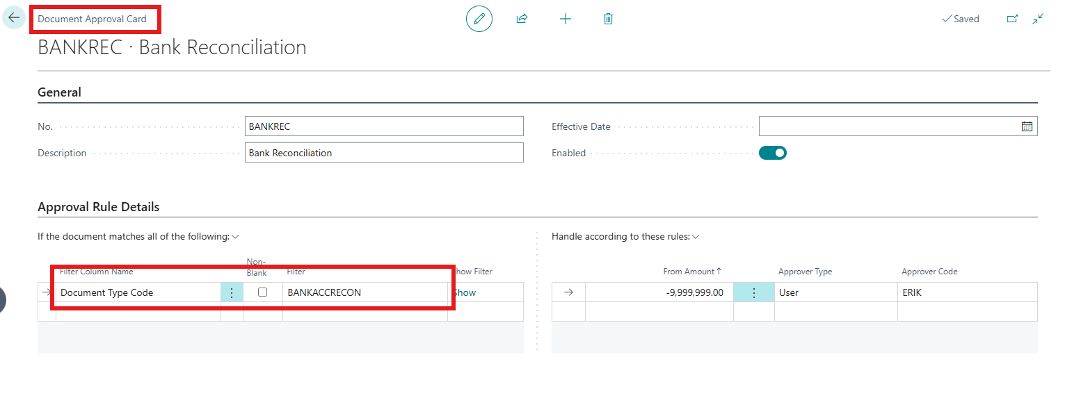 Users can now setup document approvals using Document Type Code of BANKACCRECON. This will enforce approvals in the Bank Acc. Reconciliation page.