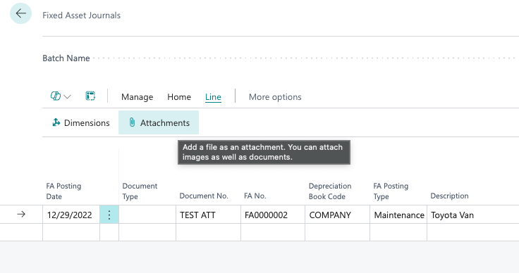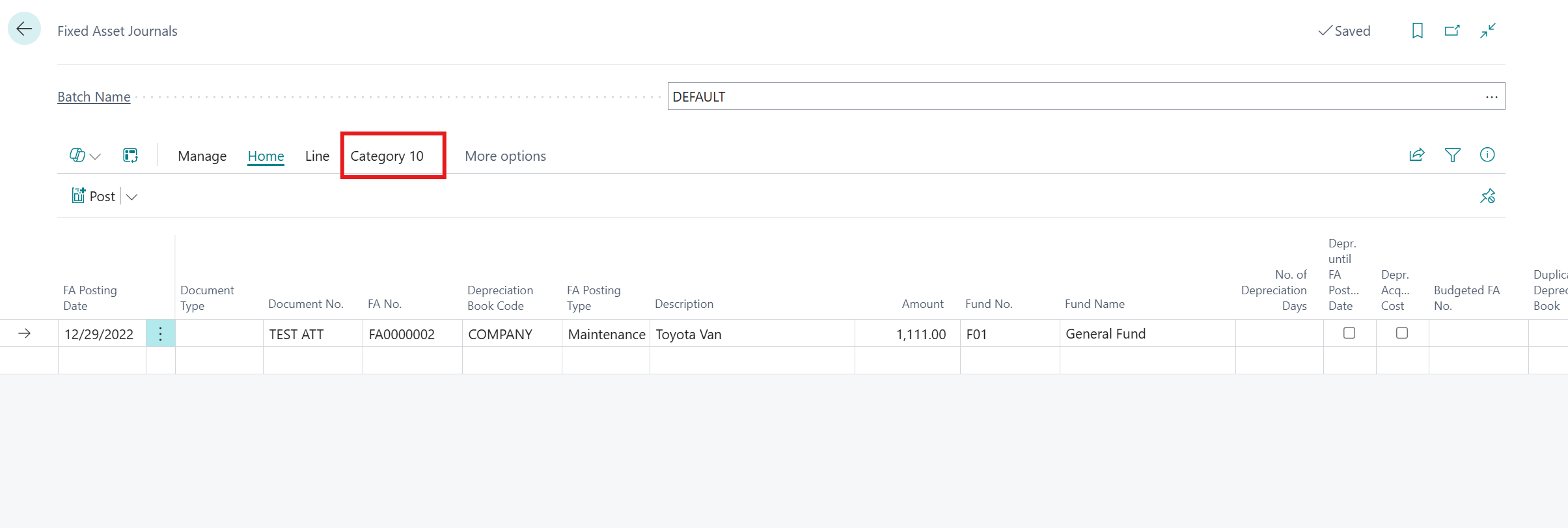 Previously the Fixed Asset Journals page had a menu item labeled as Category 10. This menu item has been removed and the action for Attachments has been moved to the Line menu.