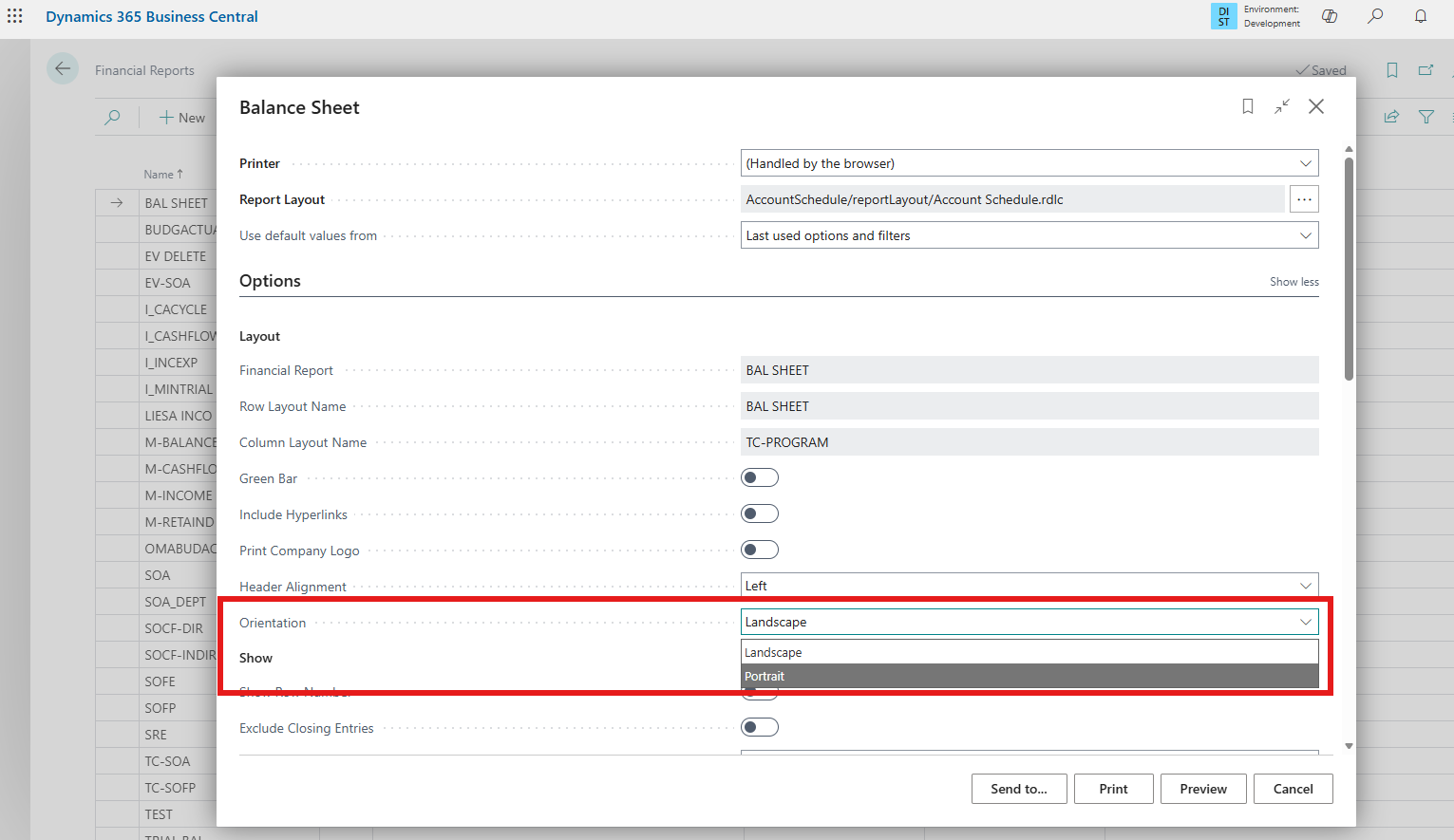 From Financial Reports page select the action Print >> Print. When changing Orientation to Portrait mode, the wrong report would print or users would receive an error message and nothing would print.