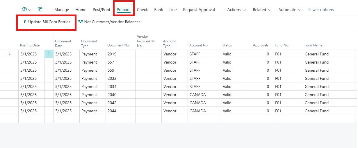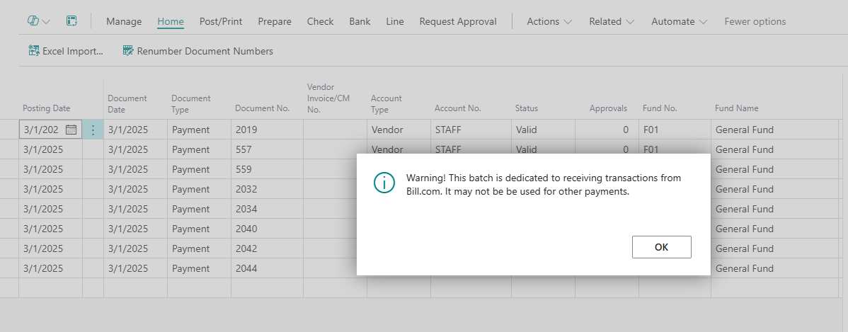 Users who open a Payment Journal Bill.Com batch, using search or with a bookmark, will get a warning message and see the Update Bill.com Entries action.