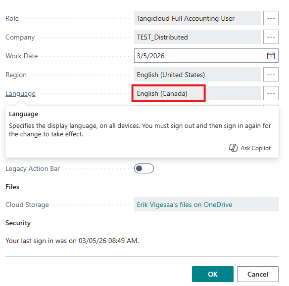 Business Central allows users to select which language will be used for display. Additional information on language setting can be found at Microsoft Learn - Language