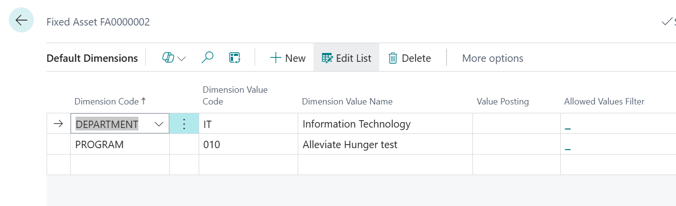 Business Central allows users to define default dimensions on Fixed Assets in order to automatically copy the dimensions to Fixed Asset entries. Additional information on Default Dimensions can be found on Microsoft Learn - To set up default dimensions